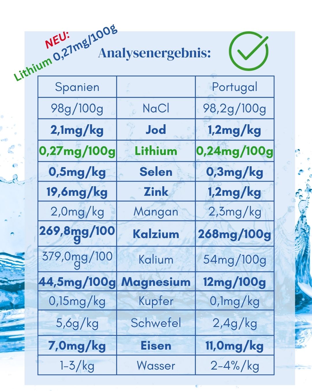 Durch diese schonende Gewinnung können wertvolle Mineralien und Spurenelemente erhalten bleiben. Selen, Eisen, Jod, Lithium, Magnesium, Kalium und Calcium sind nur einige wenige davon.